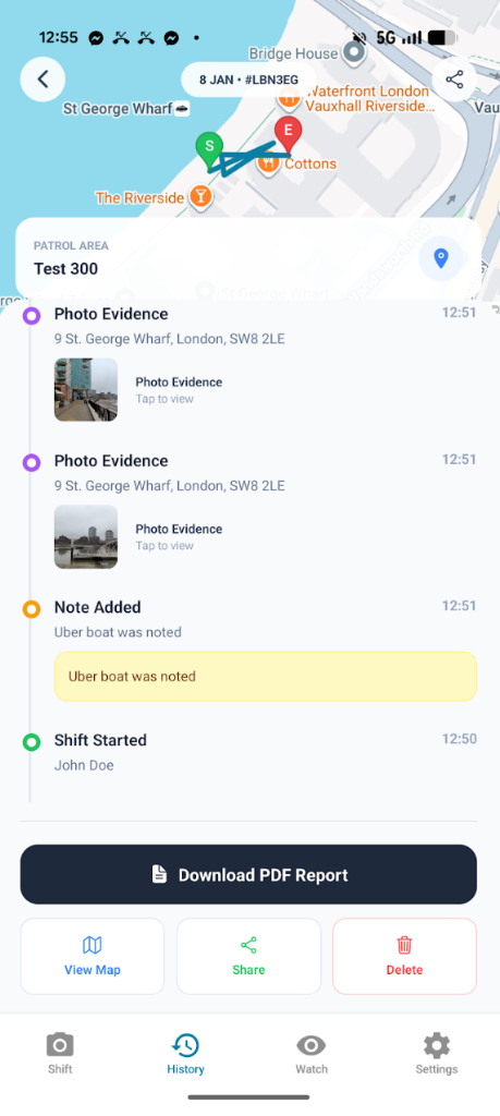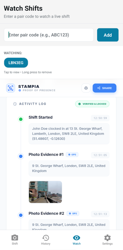 Track, capture and verify your work shifts with tamper‑evident reports. Every report includes a unique verification link so your clients can validate the evidence themselves.